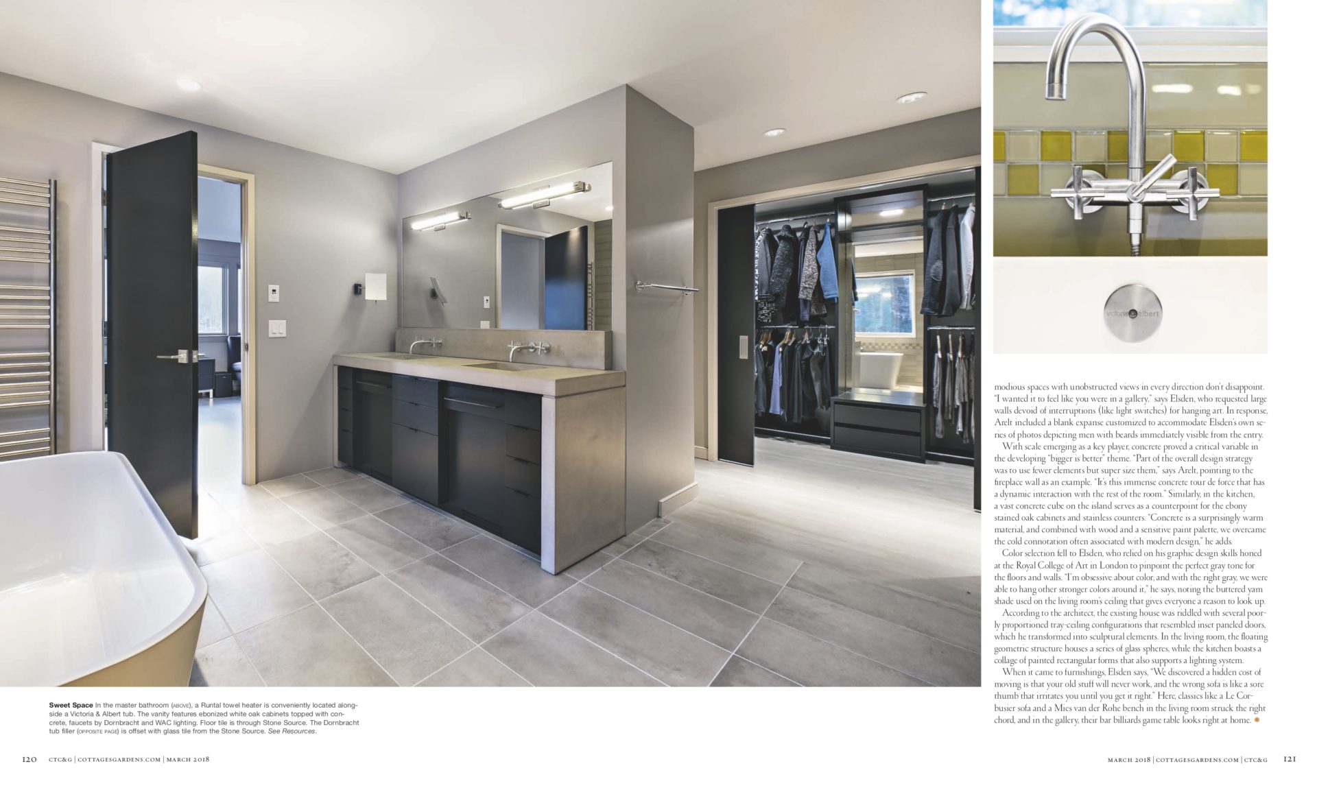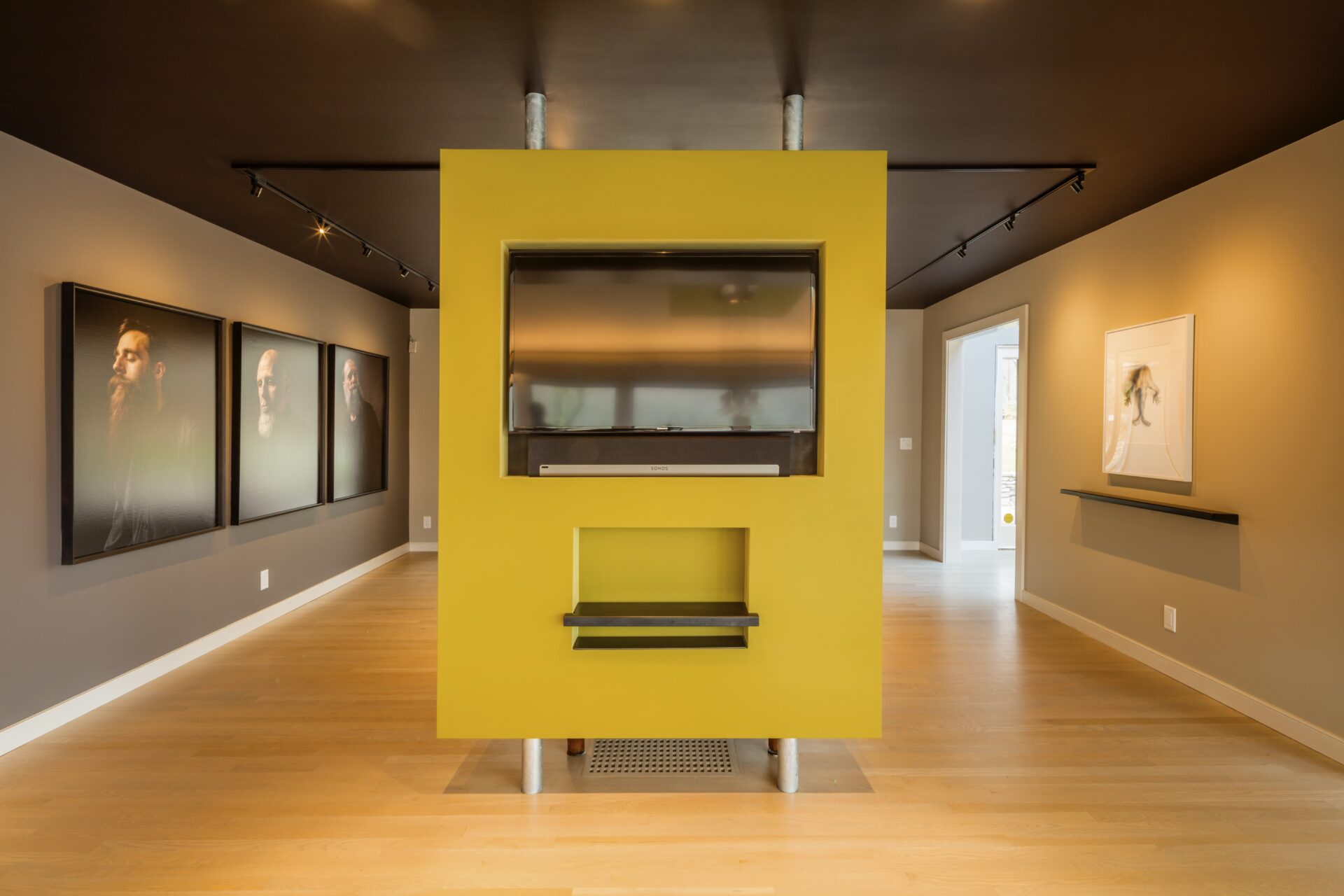 A palette of concrete, blackened steel, stainless steel and colors carefully chosen by homeowner and architect create an interior and exterior environment punctuated by moments that are as artistic as the featured works in the black-ceilinged gallery.