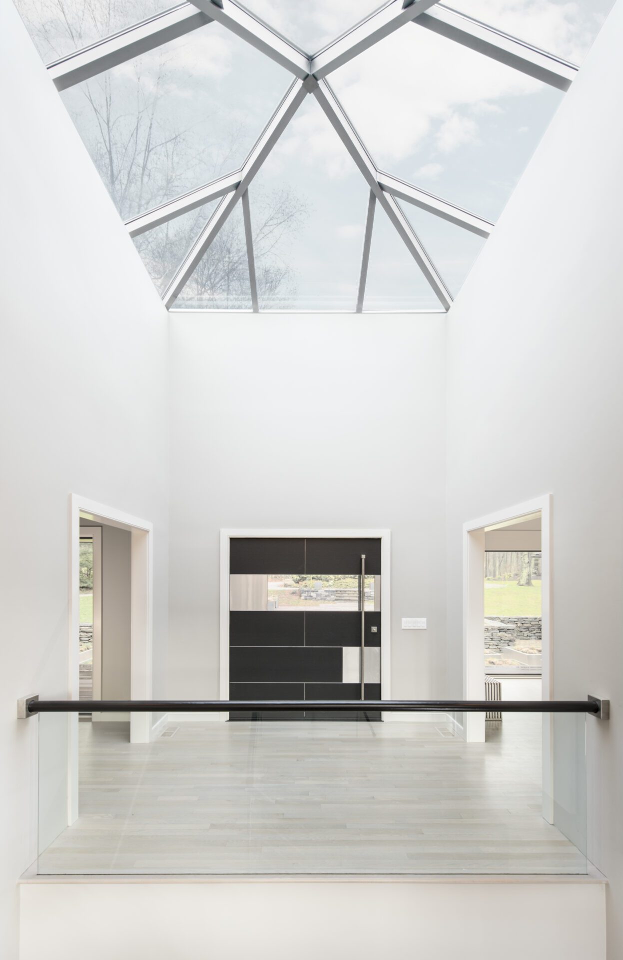 Another deficiency was the connection to the outdoors. By adding glass to the front and back of the house, and removing interior walls selectively, the house takes on a diaphanous quality that allows one to see through to the marsh beyond, even when in the driveway. The raised-bed grasses act as abstract, geometric versions of the marsh beyond. A large, pyramidal skylight establishes a spatial hierarchy around which the rooms revolve.